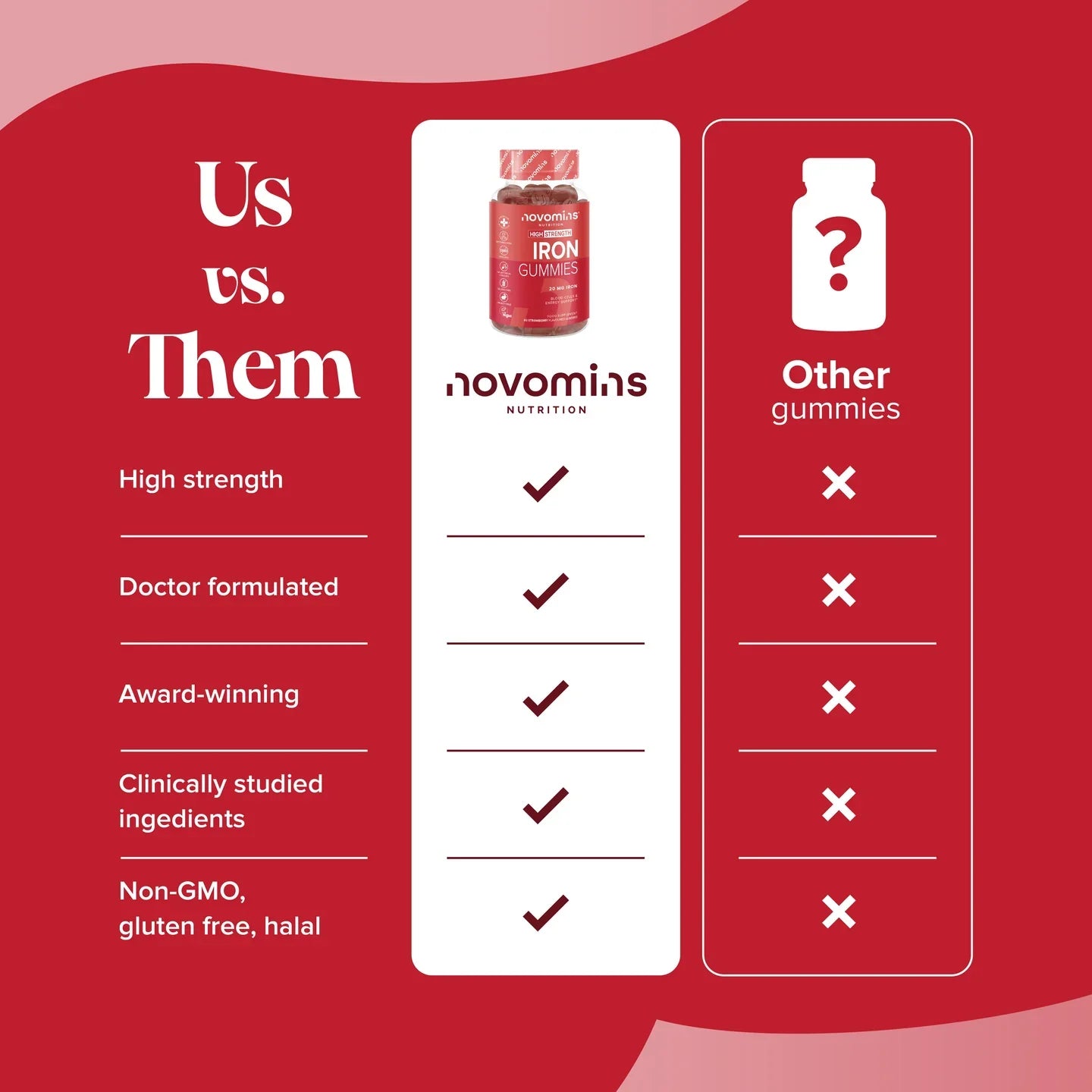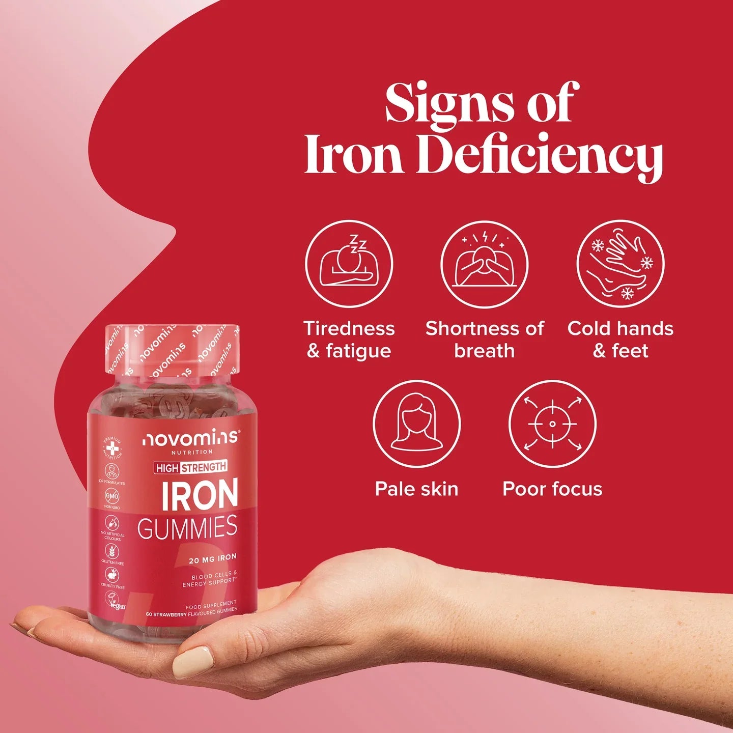 Novomins delicious, easy to chew, strawberry-favoured Iron Gummies are designed to keep your iron levels topped up and provide a much-needed boost to your body. Recharge and reinforce your energy levels today!