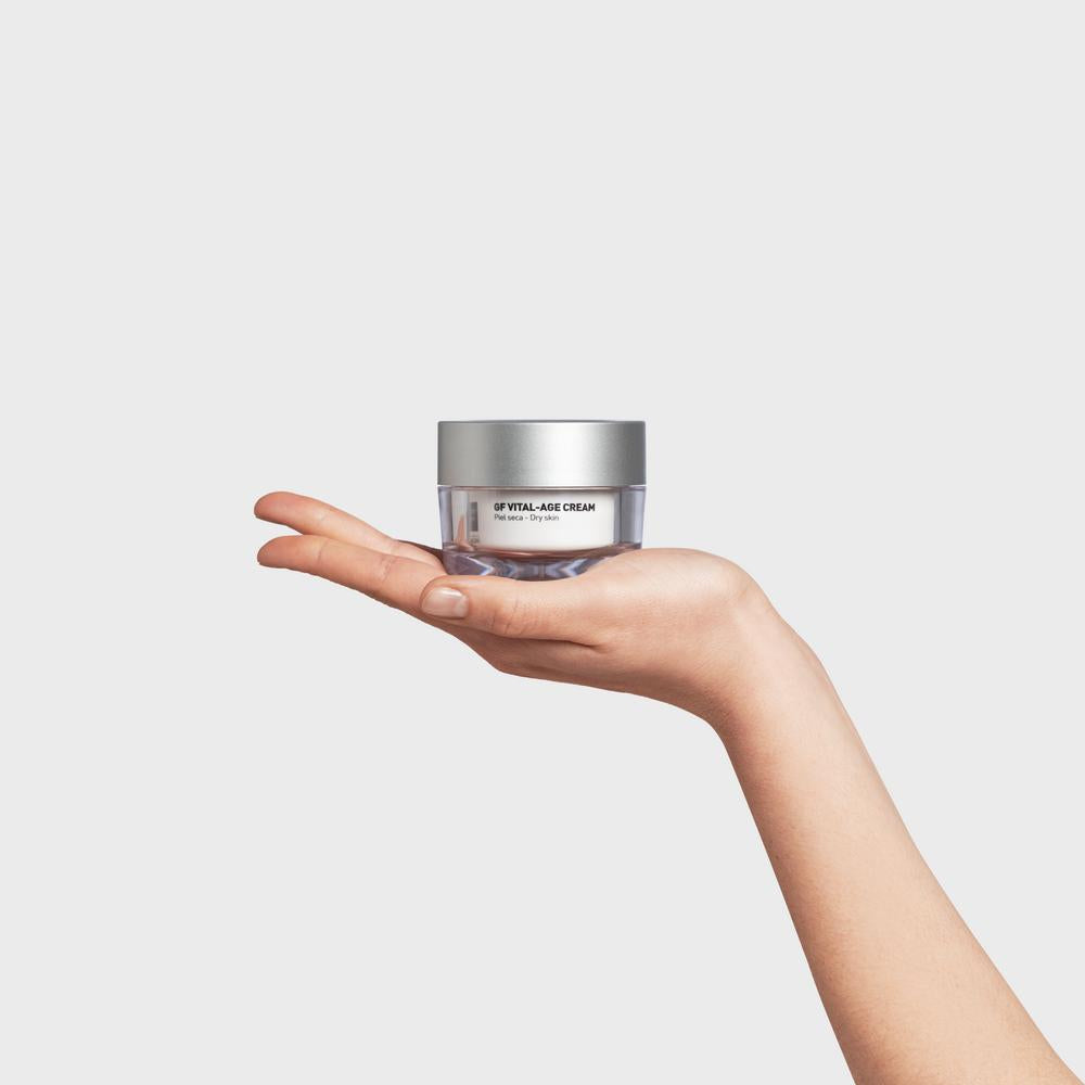 GF Vital-Age Cream has a brightening effect on dry skin. It improves its texture while moisturising, repairing and protecting. The epidermal growth factor and moisturising complex, along with its high content in jojoba and argan oil, deeply nourishes.