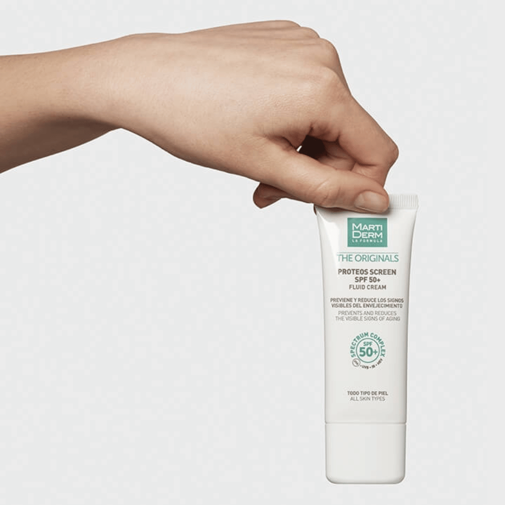 Proteos Screen SPF 50+ is a moisturising and anti-wrinkle liquid face cream with easily absorbed SPF 50+ protection that prevents and helps repair the signs of premature skin aging. The cream-to-powder texture has a silky, invisible skin feel. It provides broad-spectrum protection against UVA/UVB/IR/HEV (blue light) rays. The combination of proteoglycans and the hyaluronic acid and silicon complex helps keep skin looking young, fresh and even.