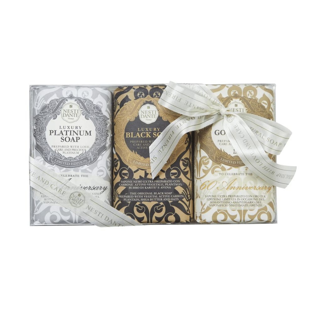 The kit with 3 Luxury Gold Platinum Black soaps , in addition to the noble metals, the charcoal present in Luxury Black helps clean the skin and contains anti-aging actives.
