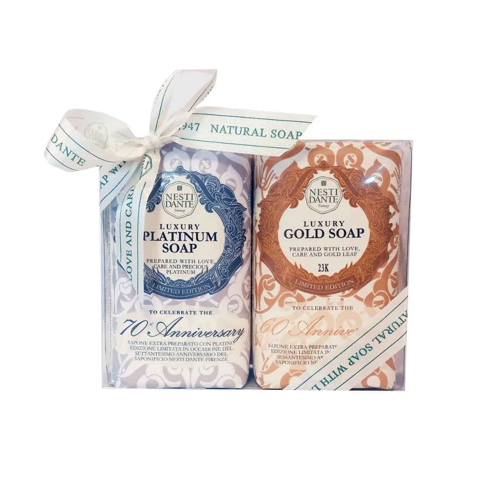 The Luxury Twin Set Gold & Platinum contains 250 g Luxury Gold Soap and 250 g Luxury Platinum Soap. Finest wellness soaps with gold and platinum in limited anniversary edition!