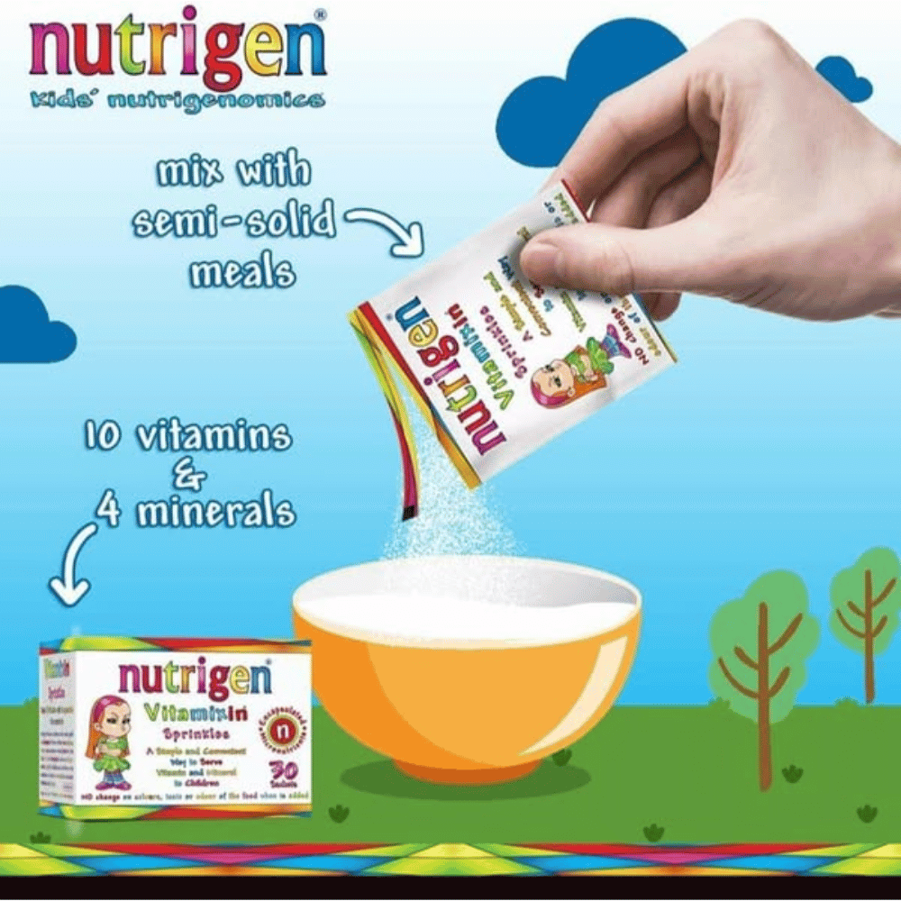 One sachet daily. Pour entire sachet to semi solid food after it has been cooked and is at a temperature acceptable to eat. Mix one sachet of Nutrigen Vitamixin Sprinkles with an amount of food that the child can consume at a single meal. Consume in 30 minutes.