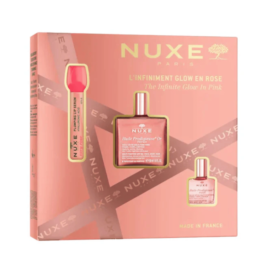 NUXE The Infinite Rose Gold Glow Gift Set is a radiant trio designed to illuminate your beauty routine with floral elegance and golden shimmer. Perfect for gifting or indulging in self-care, this set blends skincare and glow-enhancing essentials.