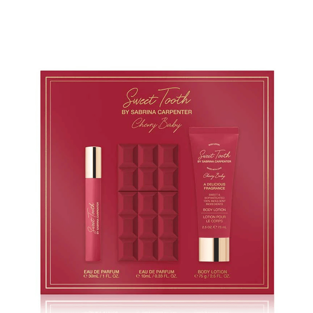 The Sabrina Carpenter Cherry Baby Gift Set features the captivating Cherry Baby Eau de Parfum in both 30ml and 10ml and a matching body lotion. With notes of cherry cosmo, glazed apple, plum nectar, and a warm blend of musk and amber, the fragrance is sweet yet sophisticated – made to turn heads and steal hearts on any special occasion. The lotion is enriched with shea butter and jojoba oil to hydrate and delicately scent the skin. This Sabrina Carpenter Gift Set is made for anyone who loves their fragrance sweet and sophisticated – the ultimate sweet treat to unwrap.