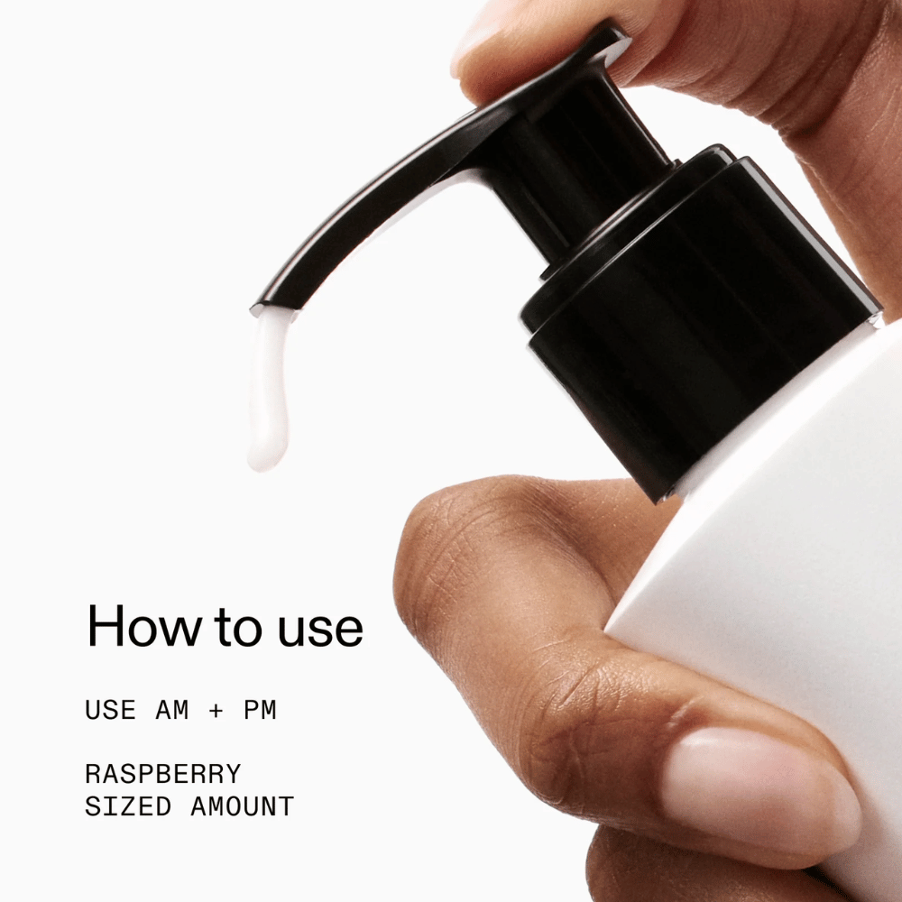 Use AM + PM as a single cleanse or the second in a double-cleanse routine. Gently massage a raspberry sized amount onto a dry face and neck. Add a splash of warm water to emulsify and gently massage into a light milk. Rinse thoroughly with water.