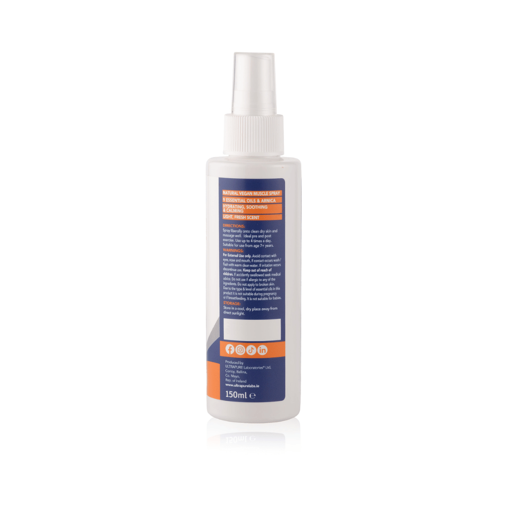 Guaranteed Irish and Vegan, ULTRAPURE Laboratories® Essential Oil Muscle Spray contains a Vegan-Friendly blend of 9 Essential Oils: Peppermint, Eucalyptus, Ginger, Black Pepper, Chamomile, Marjoram, Lavender, Rosemary (Camphor), Juniper Berry, and 4 Natural Carrier Oils: Sunflower Oil, Olive Oil, Oat Oil and Green Coffee Bean Oil. Plus Arnica Extract.